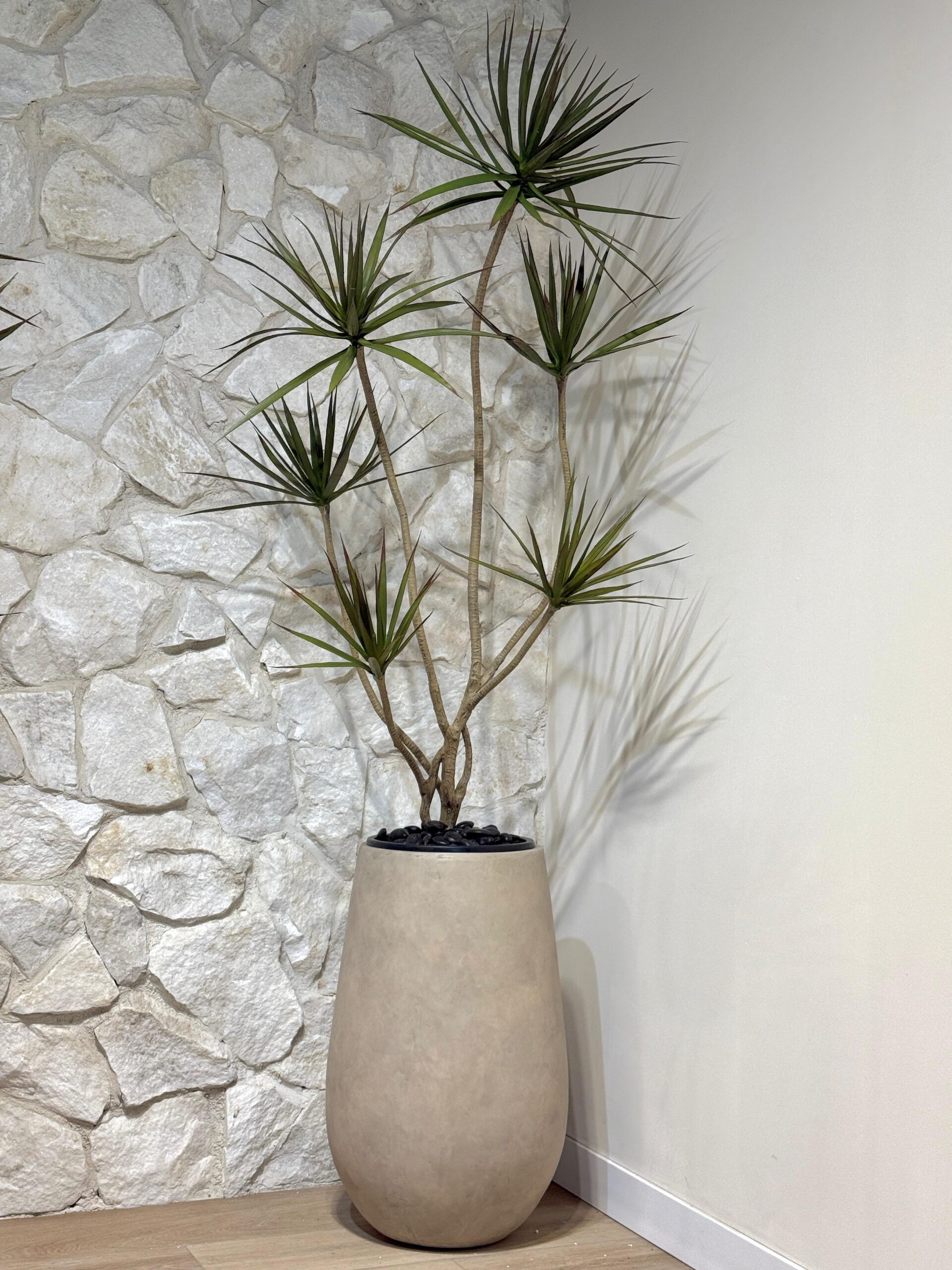 כד בטון 70 ס"מ בשילוב דרצנה מלאכותית גדולה ענקית וחיפוי חלוקי נחל לבחירה