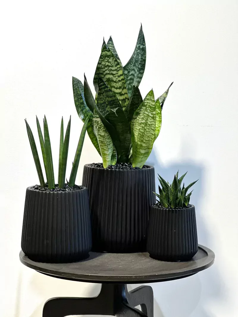 בשילוב סנסיווריה ירוקה , סנסיווריה דוקים/ צמה בהתאם למלאי וסוקולנט ירוק .