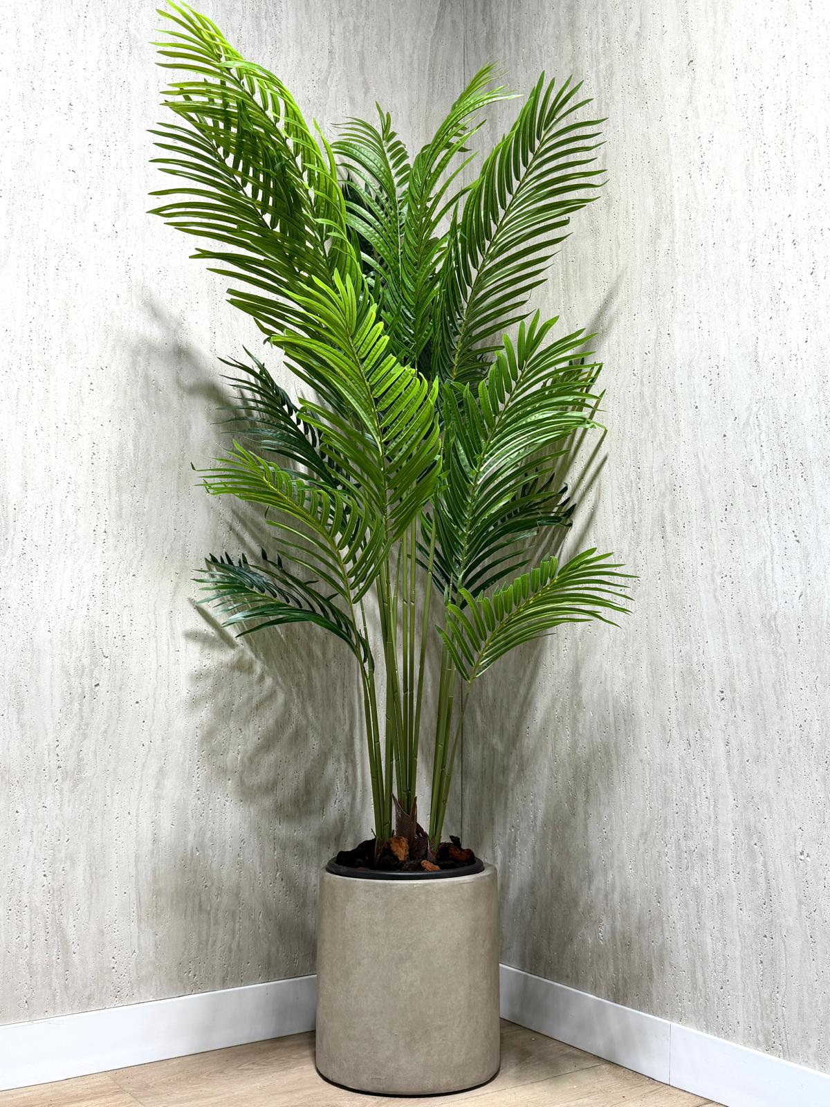 כד בטון מעוצב בצורה צילינדרית חלקה בשילוב צמח מלאכותי איכותי מסוג דקל מלאכותי גדול