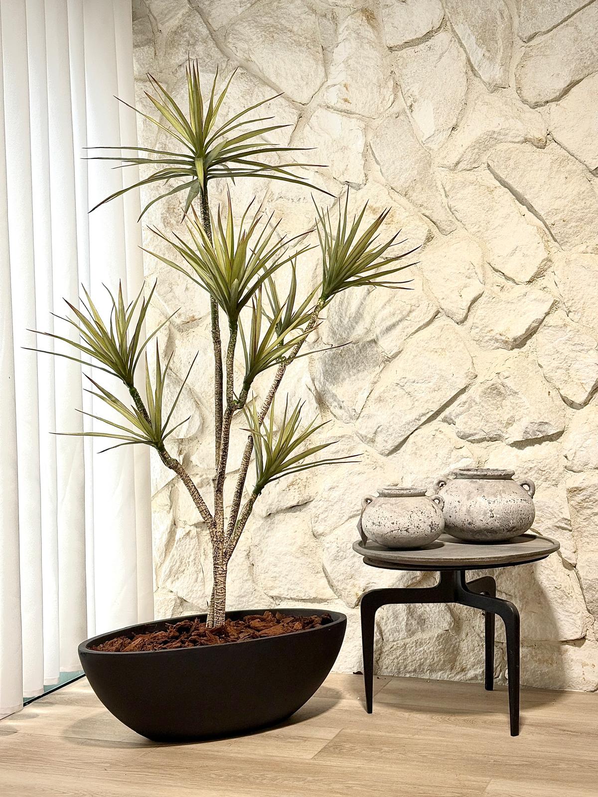 כד בטון מעוצב בצורת סירה בשילוב צמח מסוג דרצנה מלאכותית