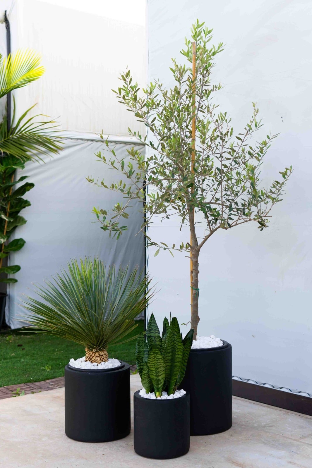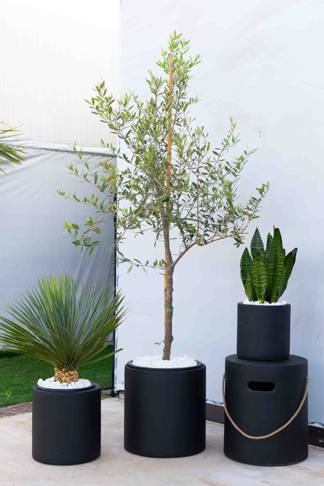 כד בטון מעוצב בצורה צילינדרית חלקה בשילוב צמחיה טבעית שופעת מסוג עץ זית ברנע + רוסטיטה ירוקה + סנסיווריה ירוקה
