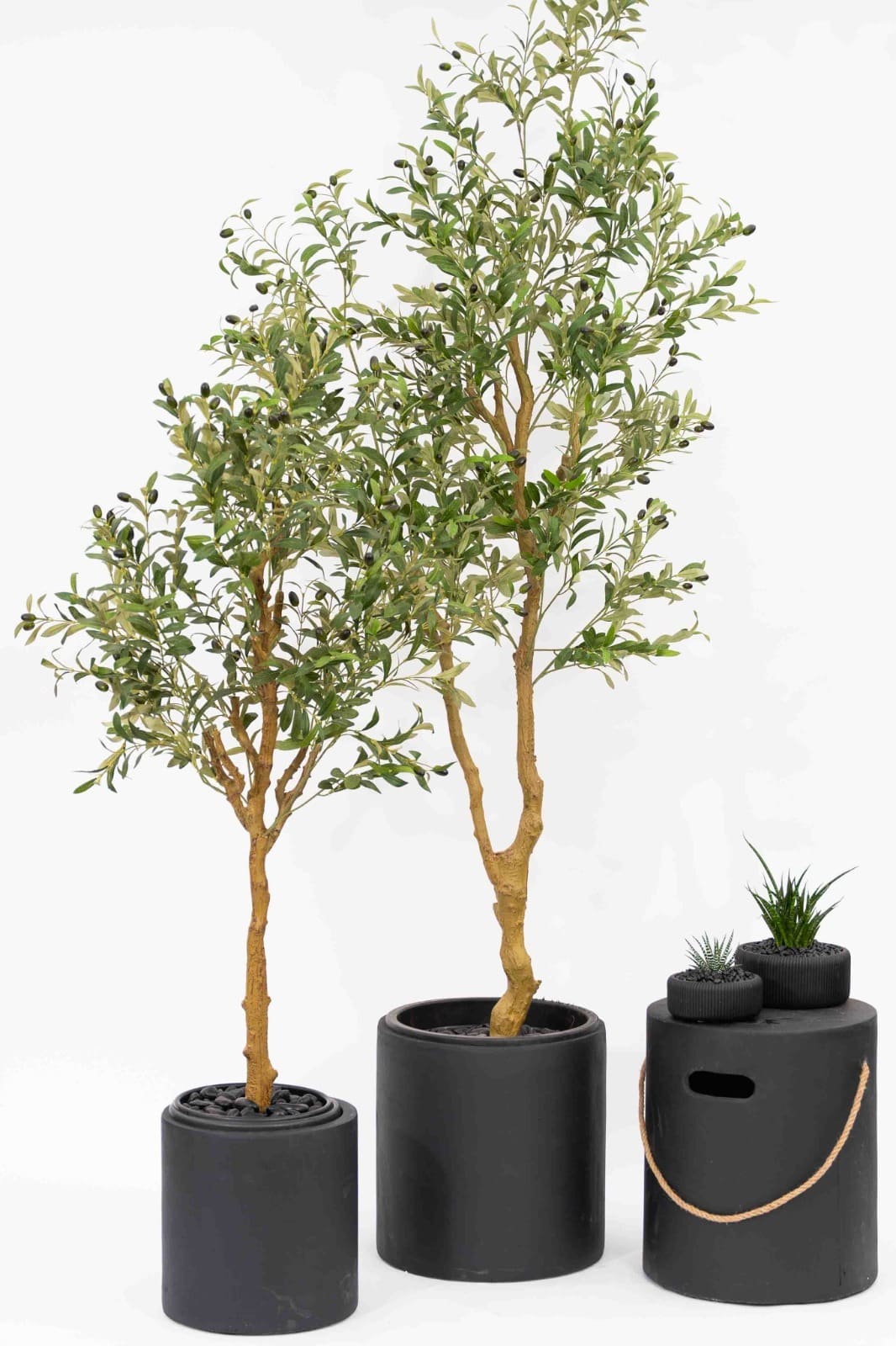 כד בטון מעוצב בצורה צילינדרית חלקה בשילוב צמח מלאכותי איכותי מסוג עץ זית מלאכותי גדול\ענק.