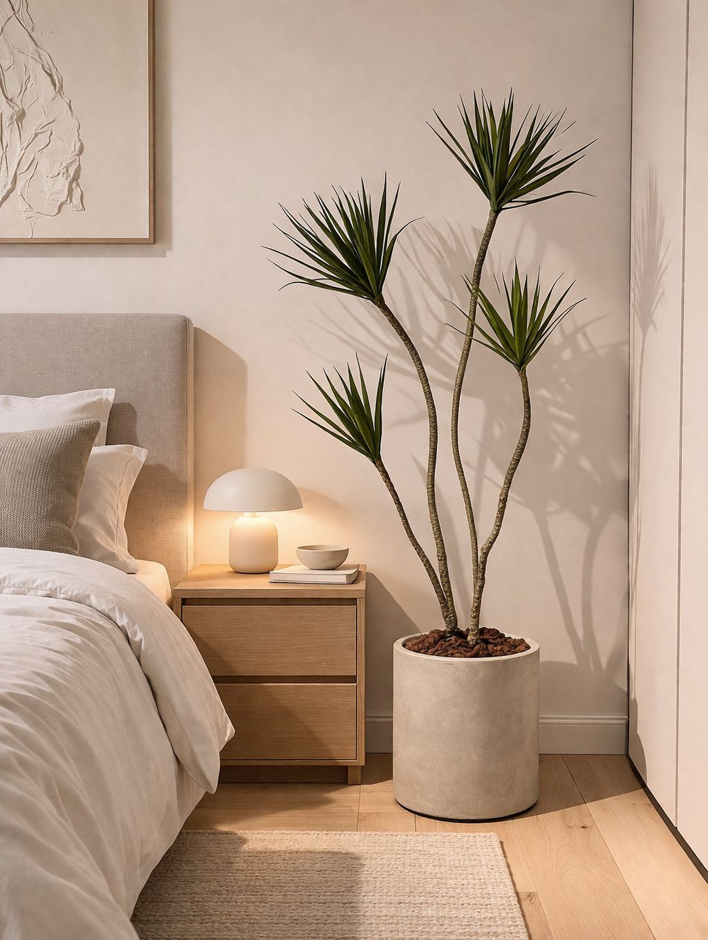 כד בטון מעוצב בצורה צילינדרית חלקה בשילוב צמח מלאכותי איכותי מסוג דרצנה מלאכותית רביעייה