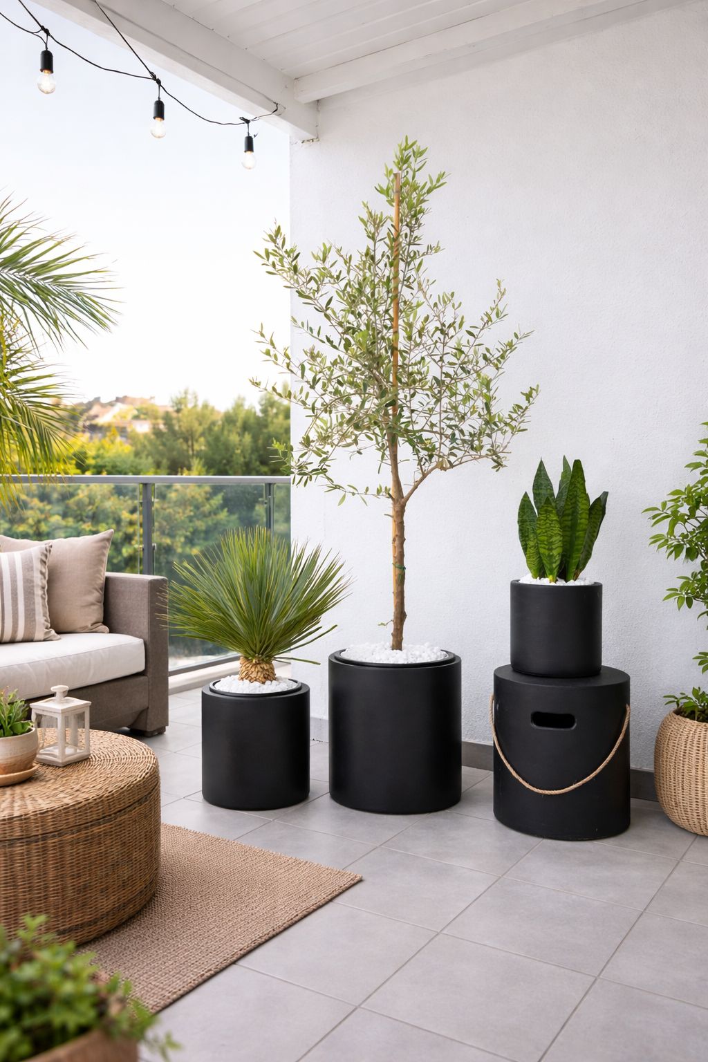 כד בטון מעוצב בצורה צילינדרית חלקה בשילוב צמחיה טבעית שופעת מסוג עץ זית ברנע + רוסטיטה ירוקה + סנסיווריה ירוקה