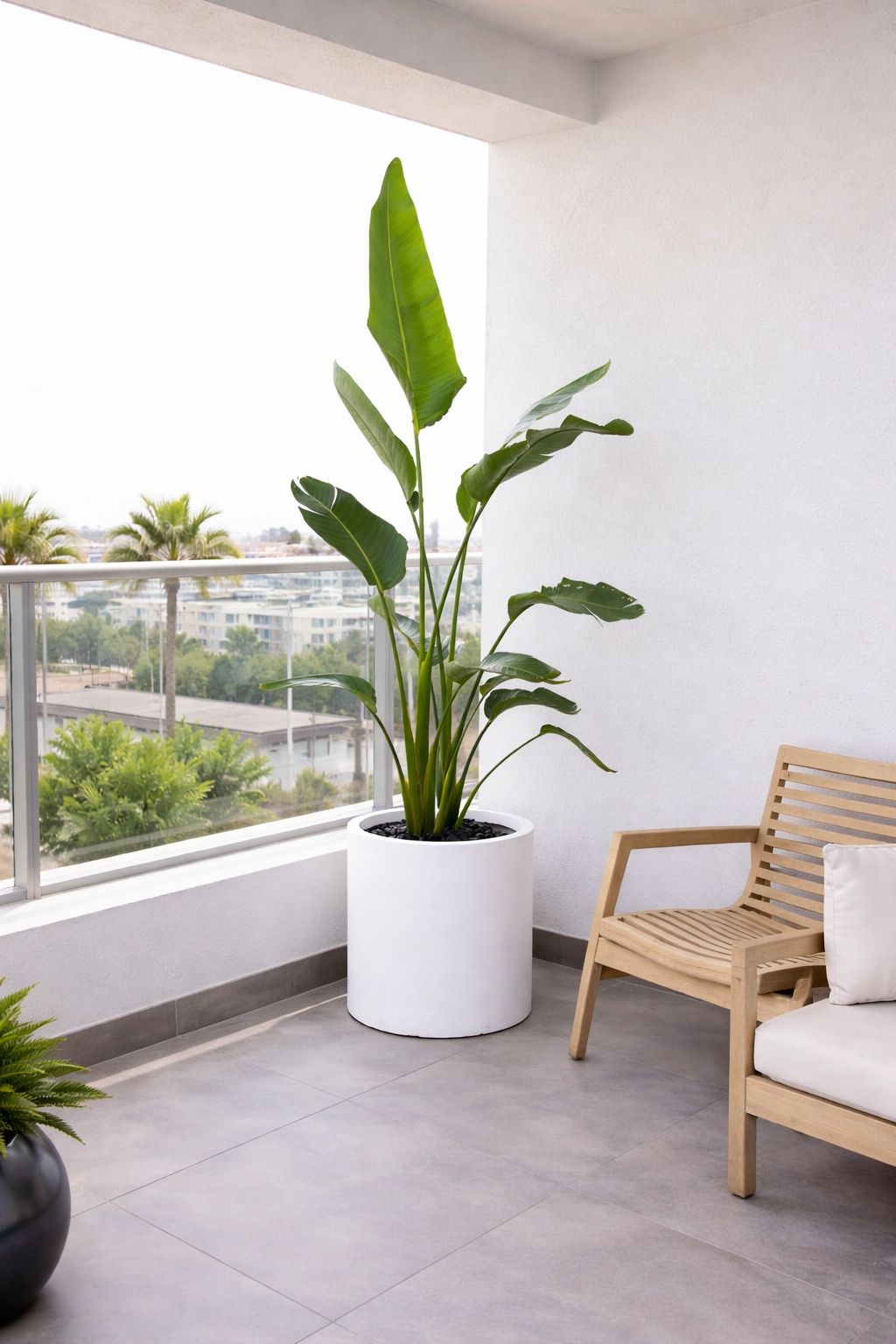 כד בטון מעוצב בצורה צילינדרית חלקה בשילוב צמח טבעי מסוג ציפור גן עדן