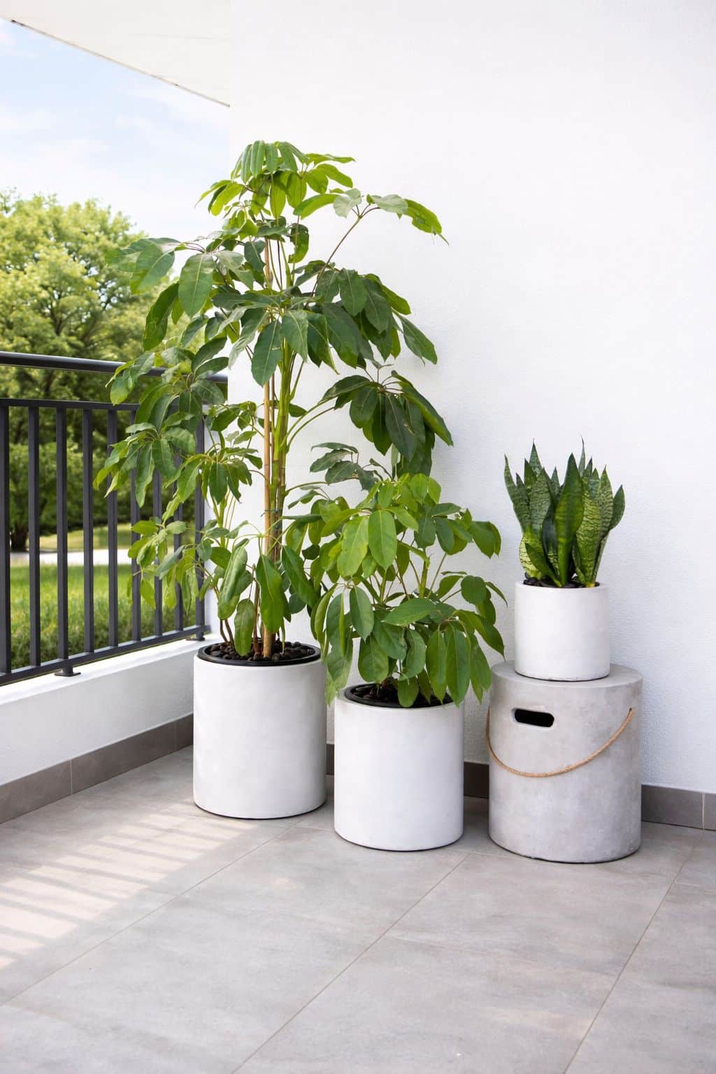 כד בטון מעוצב בצורה צילינדרית חלקה בשילוב צמח טבעי שופע מסוג שיפלרה ירוקה וסנסיווריה ירוקה