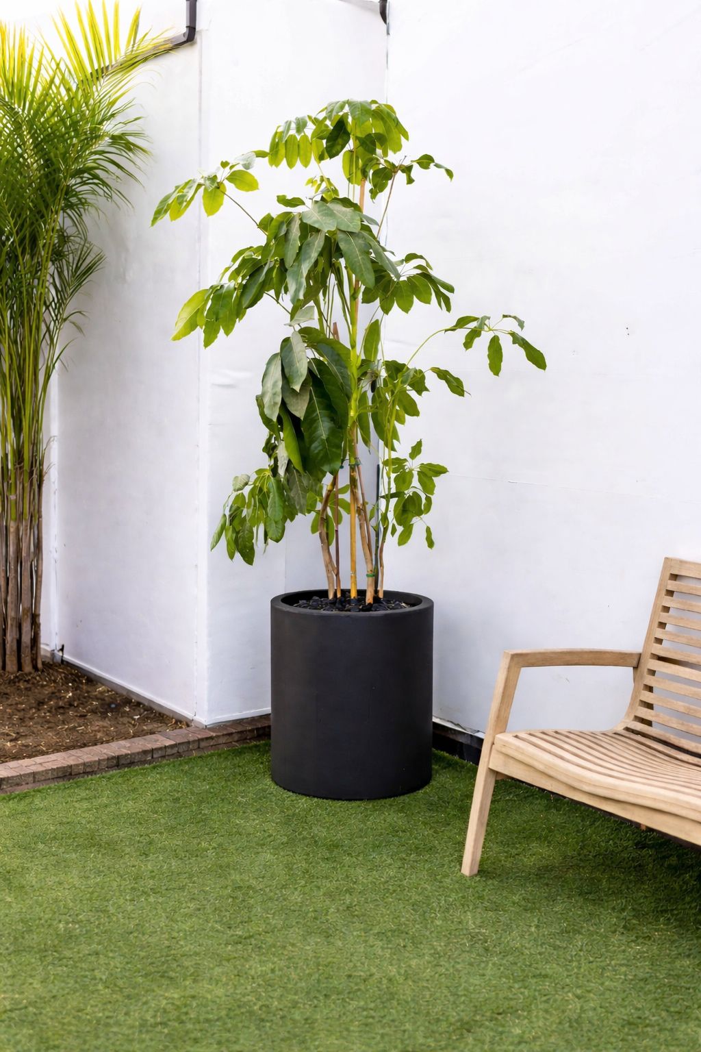 כד בטון מעוצב בצורה צילינדרית חלקה בשילוב צמח טבעי מסוג שיפלרה ירוקה