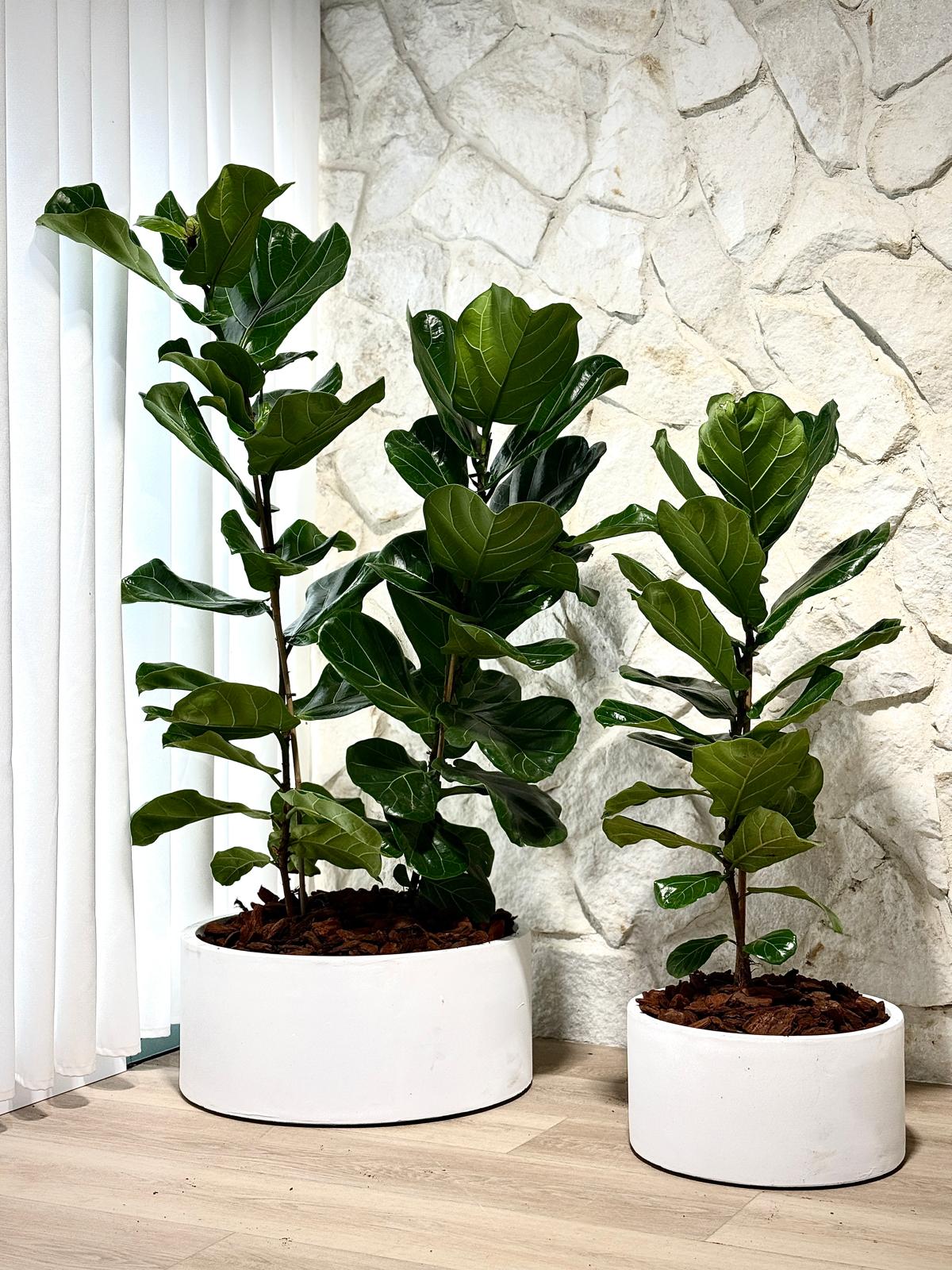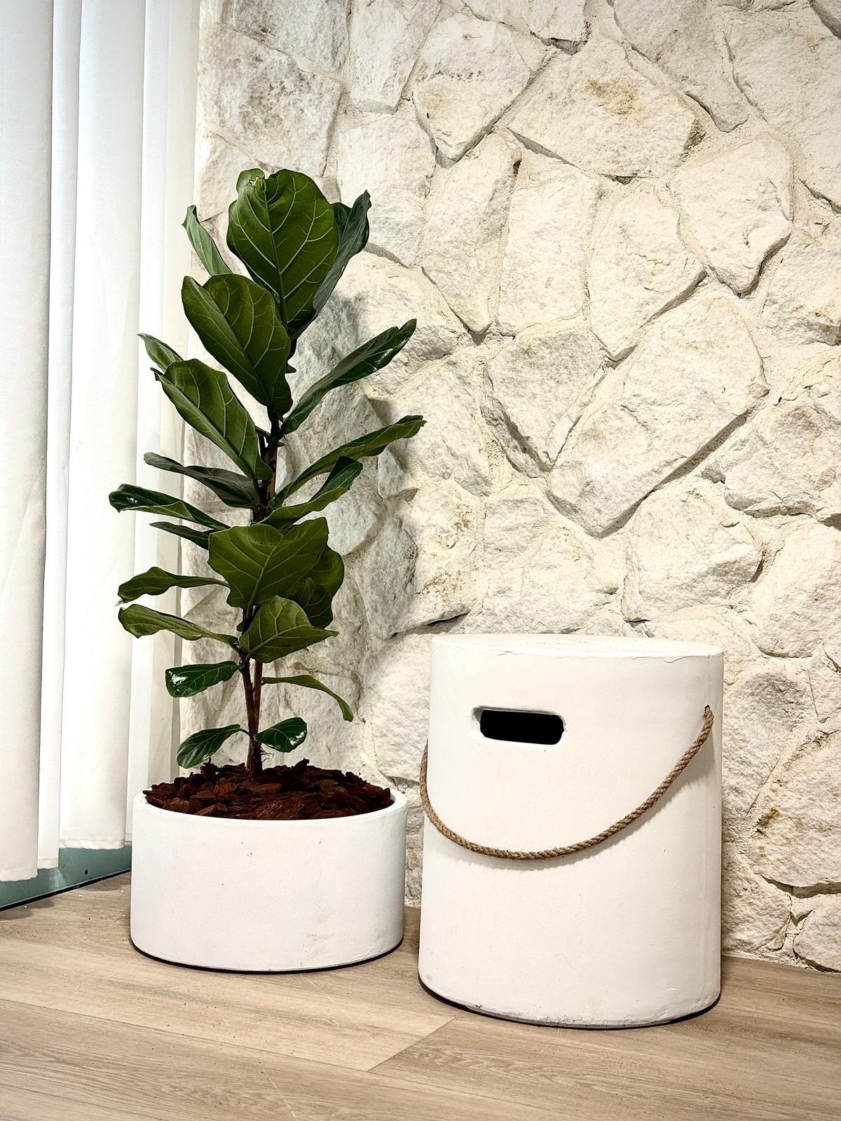 קערות צילינדר שטוחות ורחבות מבטון בשלוב צמחייה טבעית .