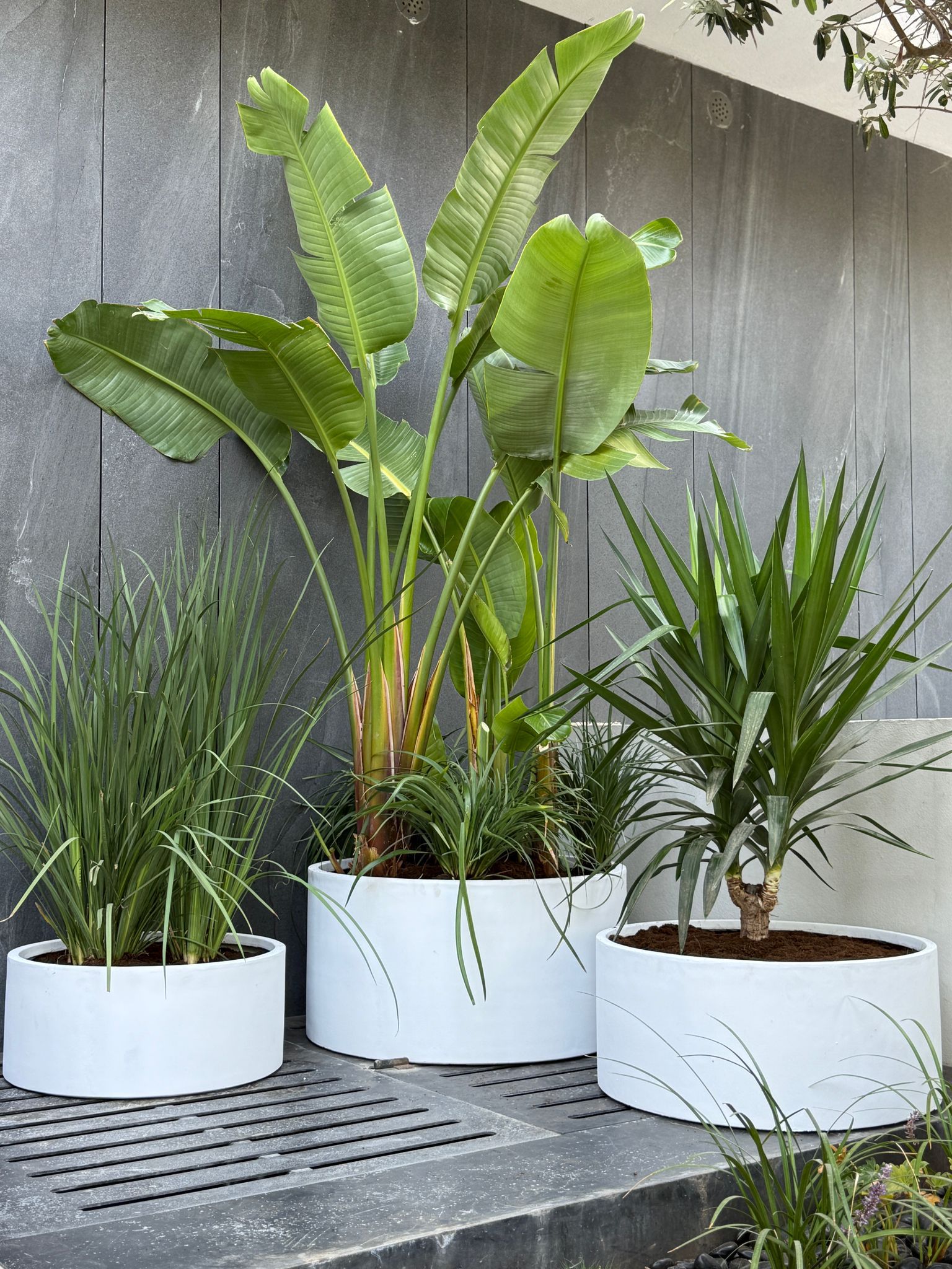 קערות צילינדר שטוחות ורחבות מבטון בשלוב צמחייה טבעית .