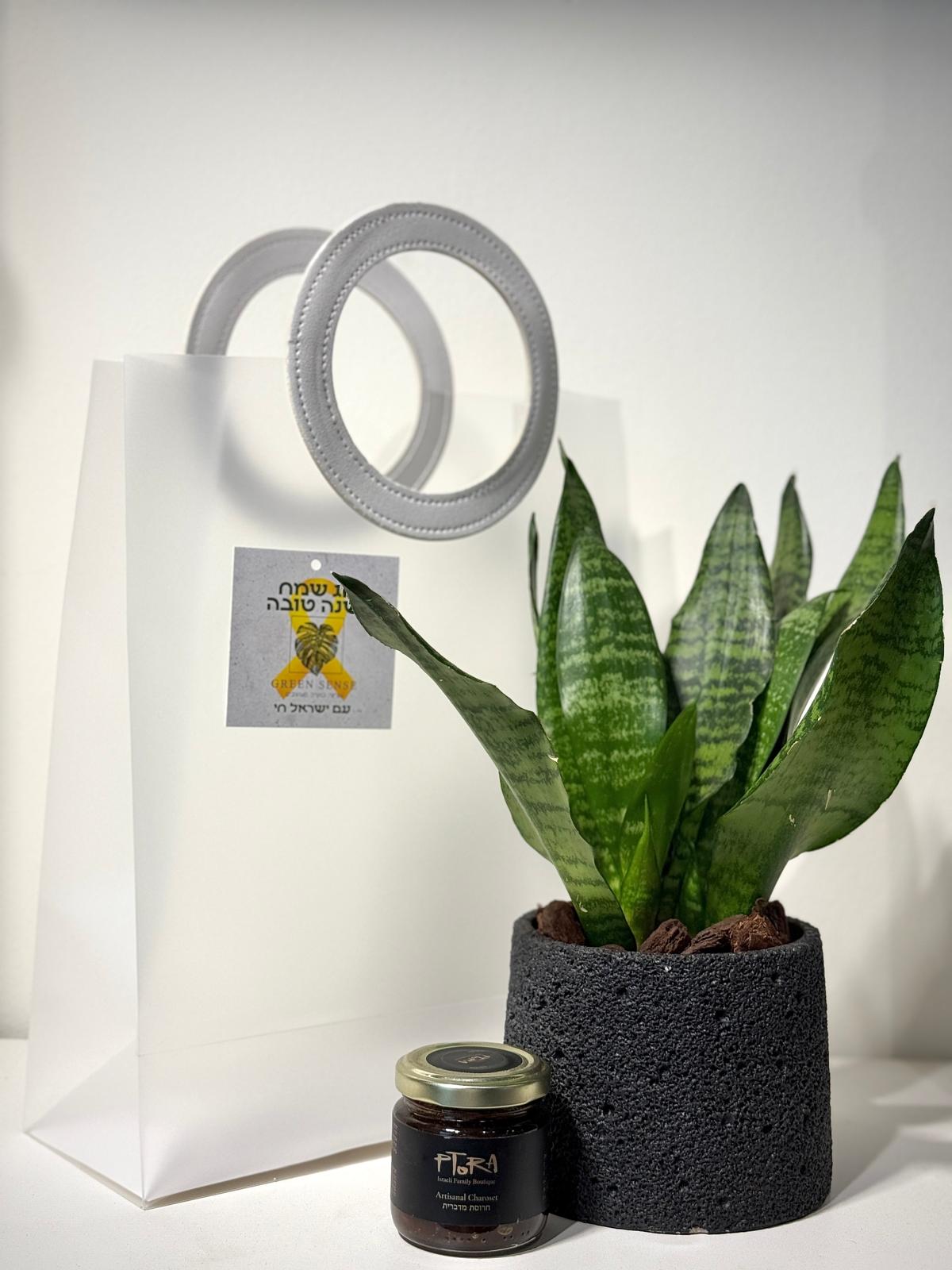 כלי בטון מחוספס שחור בשילוב סנסיווריה ירוקה וצנצנת דבש.