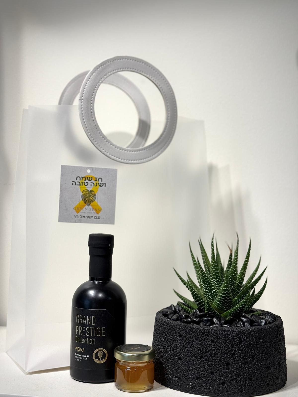 כלי בטון מחוספס שחור בשילוב סנסיווריה ירוקה, צנצנת דבש + שמן זית 200 מ"ל.