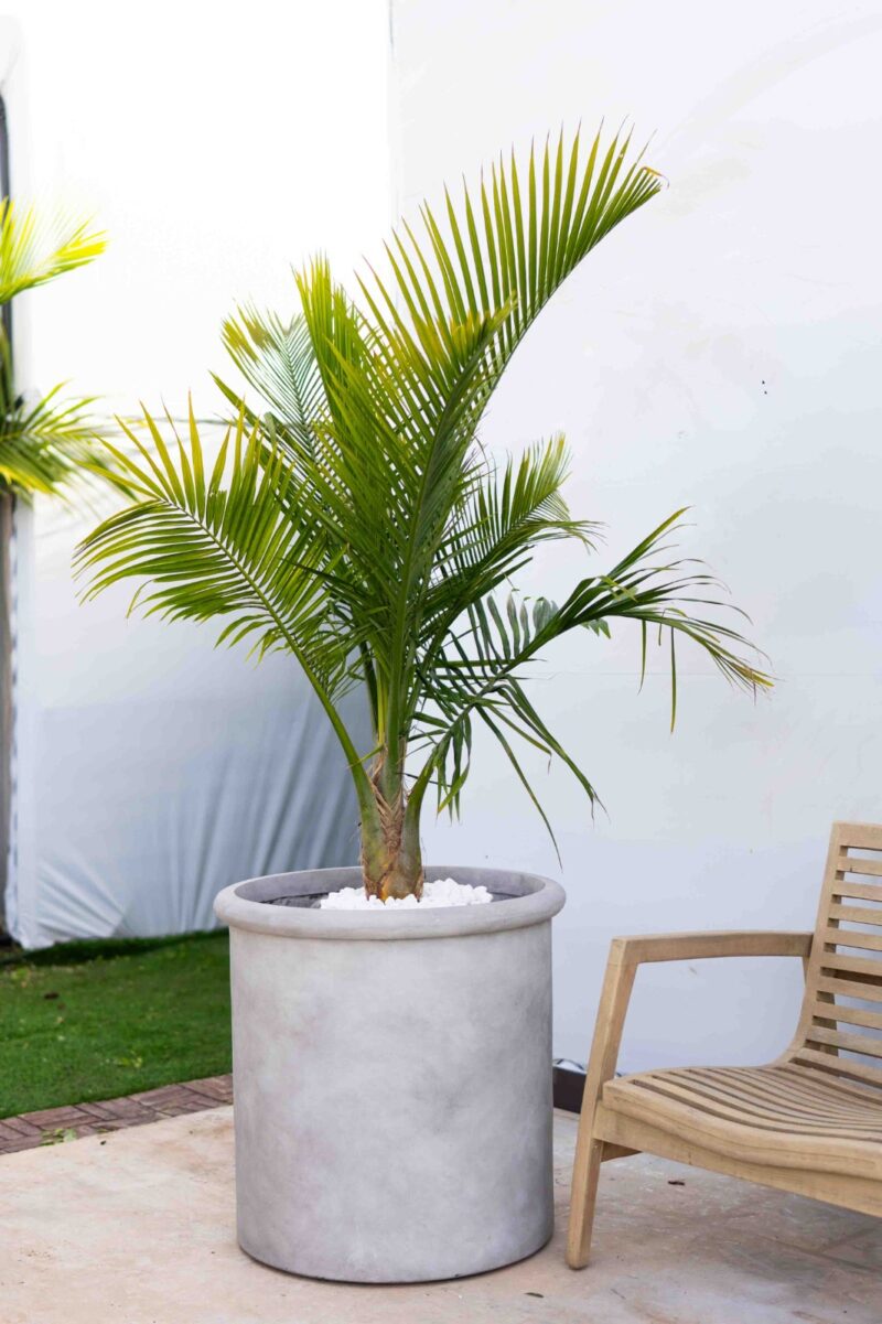 כד בטון מעוצב בצורה צילינדרית חלקה בתוספת קאנט צמיגי בשילוב צמח טבעי מסוג דקל רוונאה