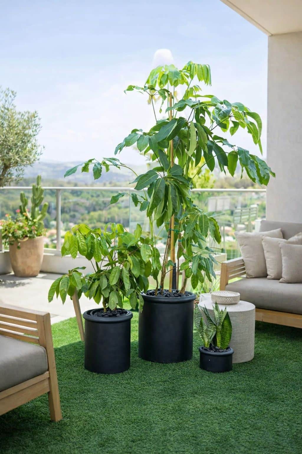 כד בטון מעוצב בצורה צילינדרית חלקה בתוספת קאנט צמיגי בשילוב צמחיה טבעית שופעת מסוג שיפלרה ירוקה טבעית וסנסיווריה ירוקה טבעית
