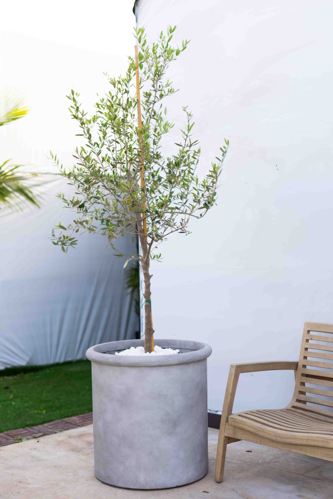 כד בטון מעוצב בצורה צילינדרית חלקה בתוספת קאנט צמיגי בשילוב צמח טבעי מסוג עץ זית