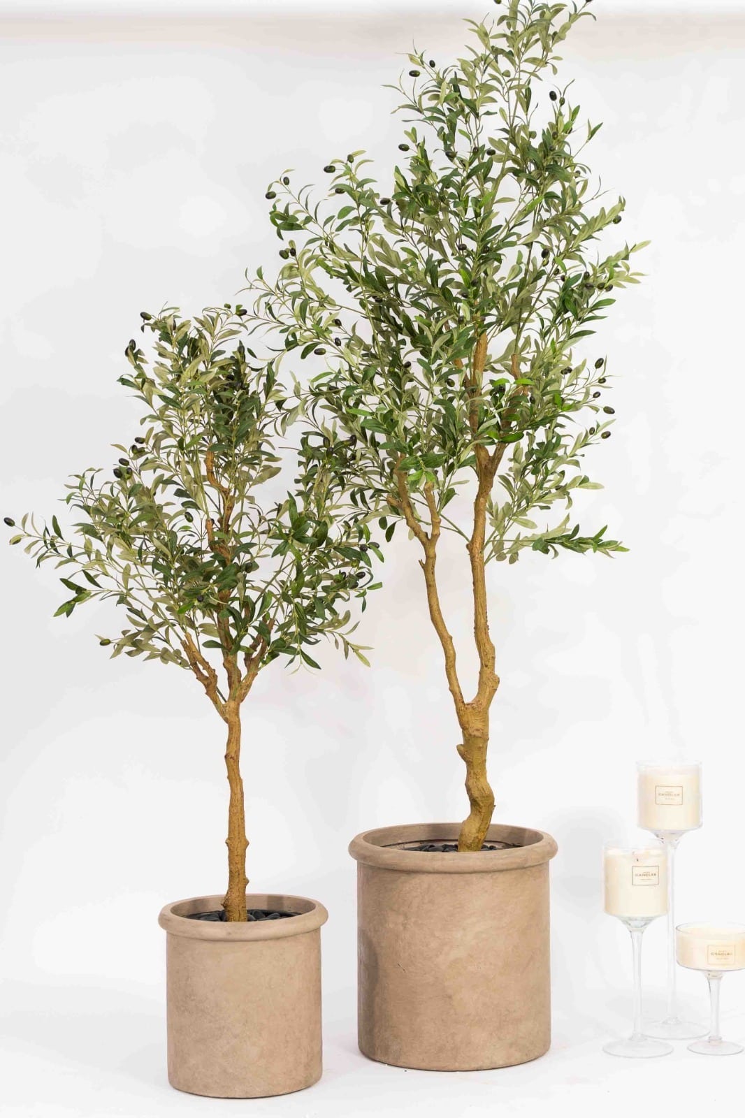 כד בטון מעוצב בצורה צילינדרית חלקה בתוספת קאנט צמיגי בשילוב צמח מלאכותי איכותי מסוג עץ זית מלאכותי גדולענק.