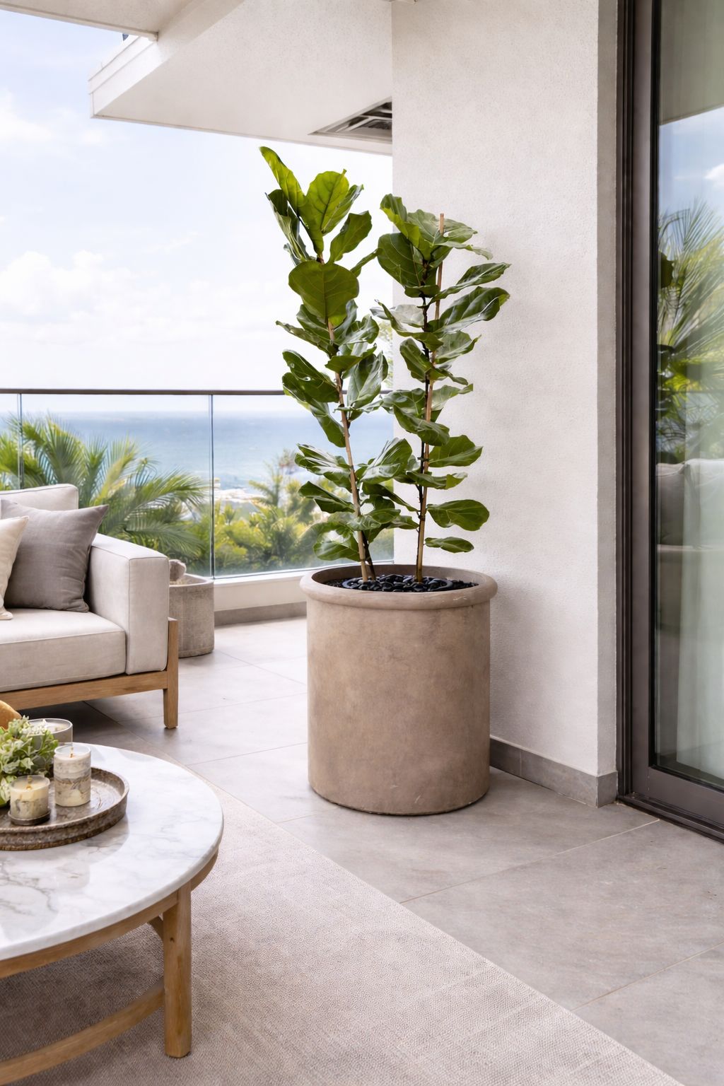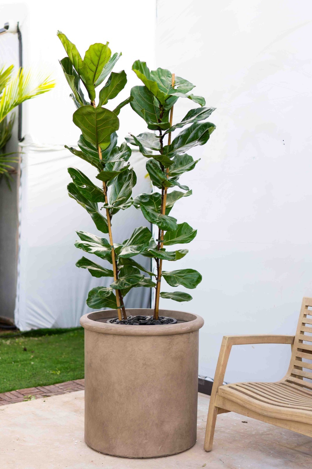 כד בטון מעוצב בצורה צילינדרית חלקה בתוספת קאנט צמיגי בשילוב צמח טבעי מסוג פיקוס כינורי