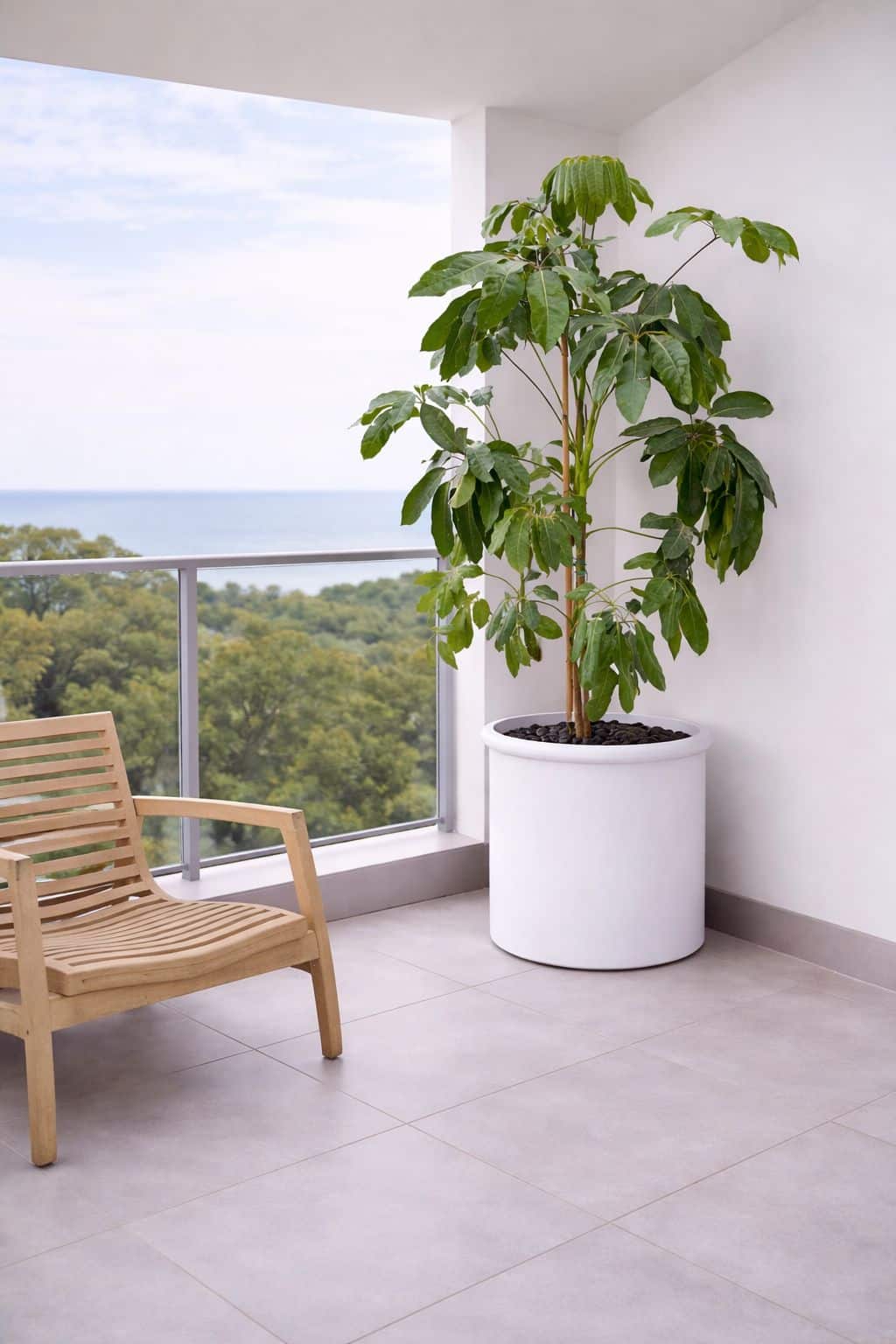כד בטון מעוצב בצורה צילינדרית חלקה בתוספת קאנט צמיגי בשילוב צמח טבעי מסוג שיפלרה ירוקה