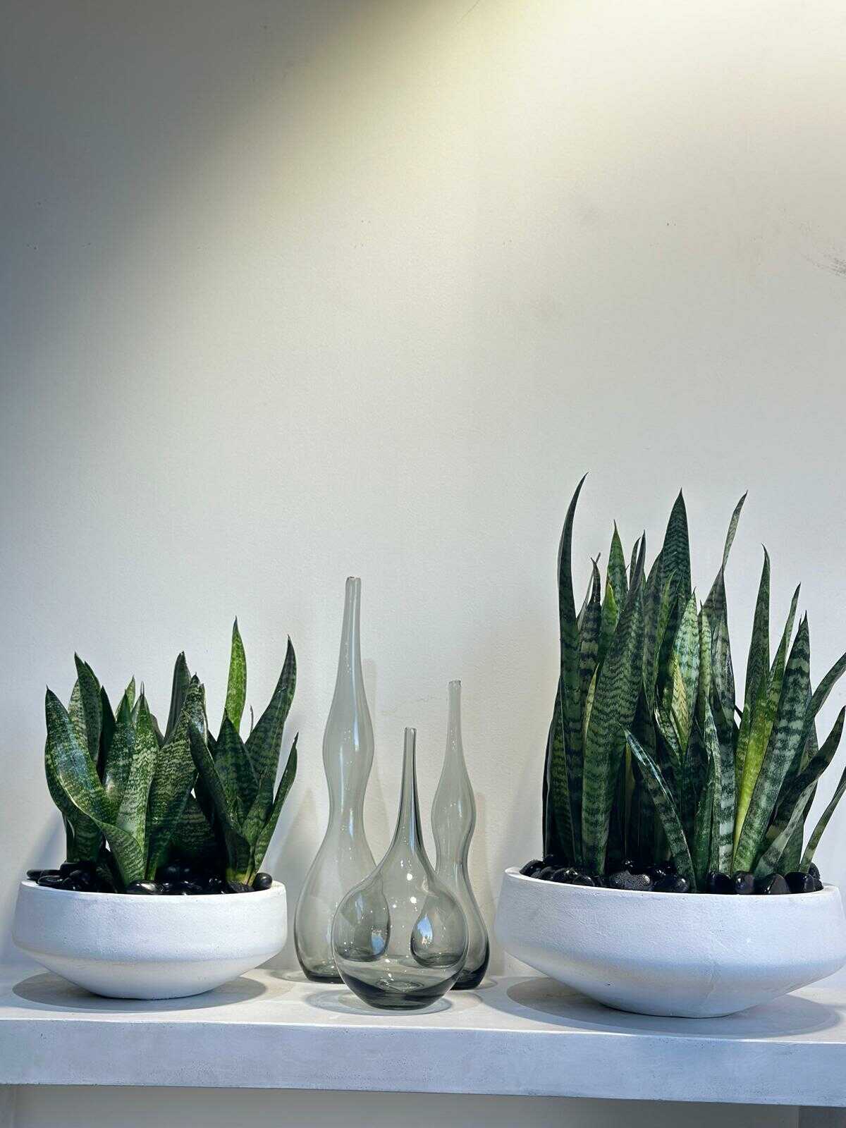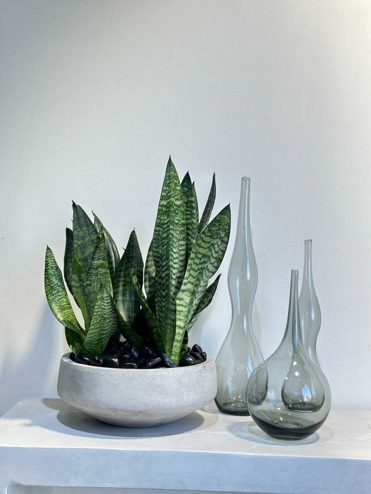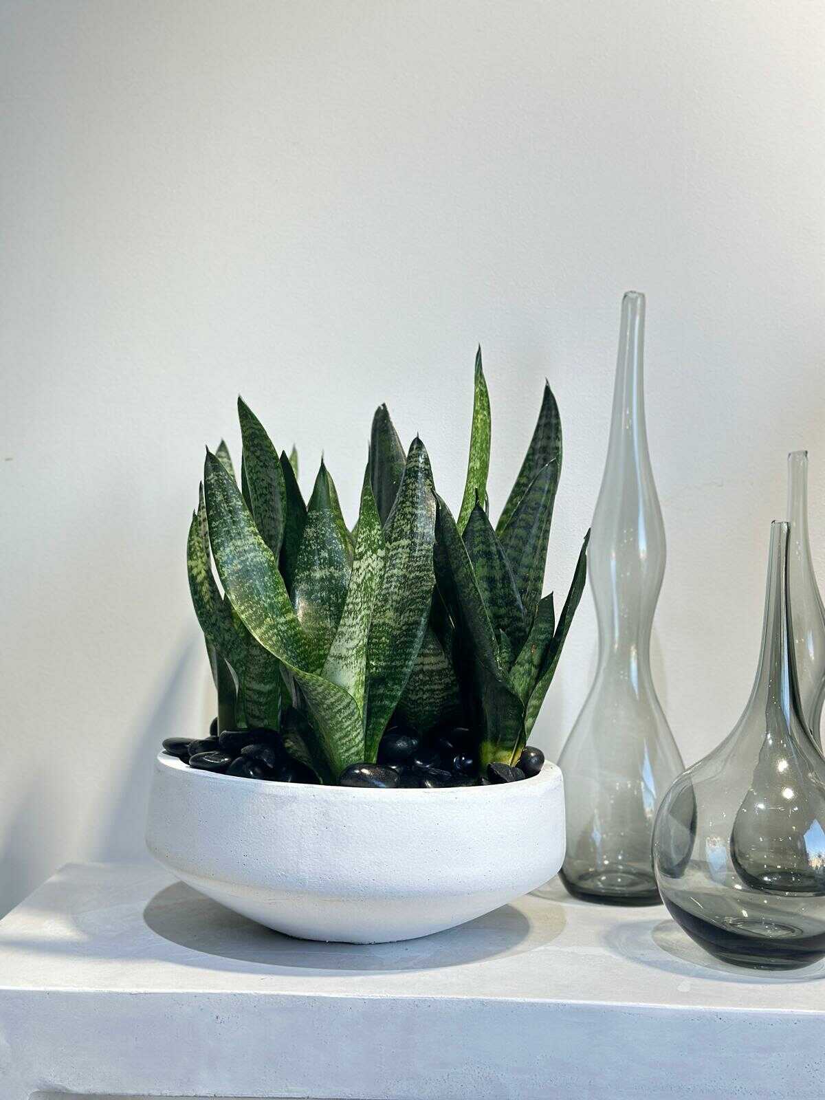 כלי בטון בצורת צלחת בשילוב צמח טבעי מסוג סנסיווריה ירוקה וחלוקי נחל לחיפוי .