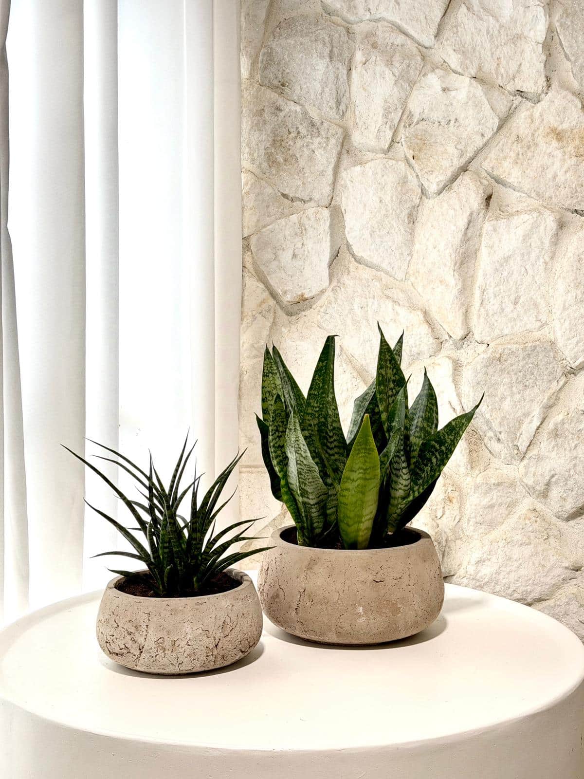 זוג כלי בטון מעוצבים בשילוב סנסיווריה ירוקה וסנסיווריה מסולסלת.