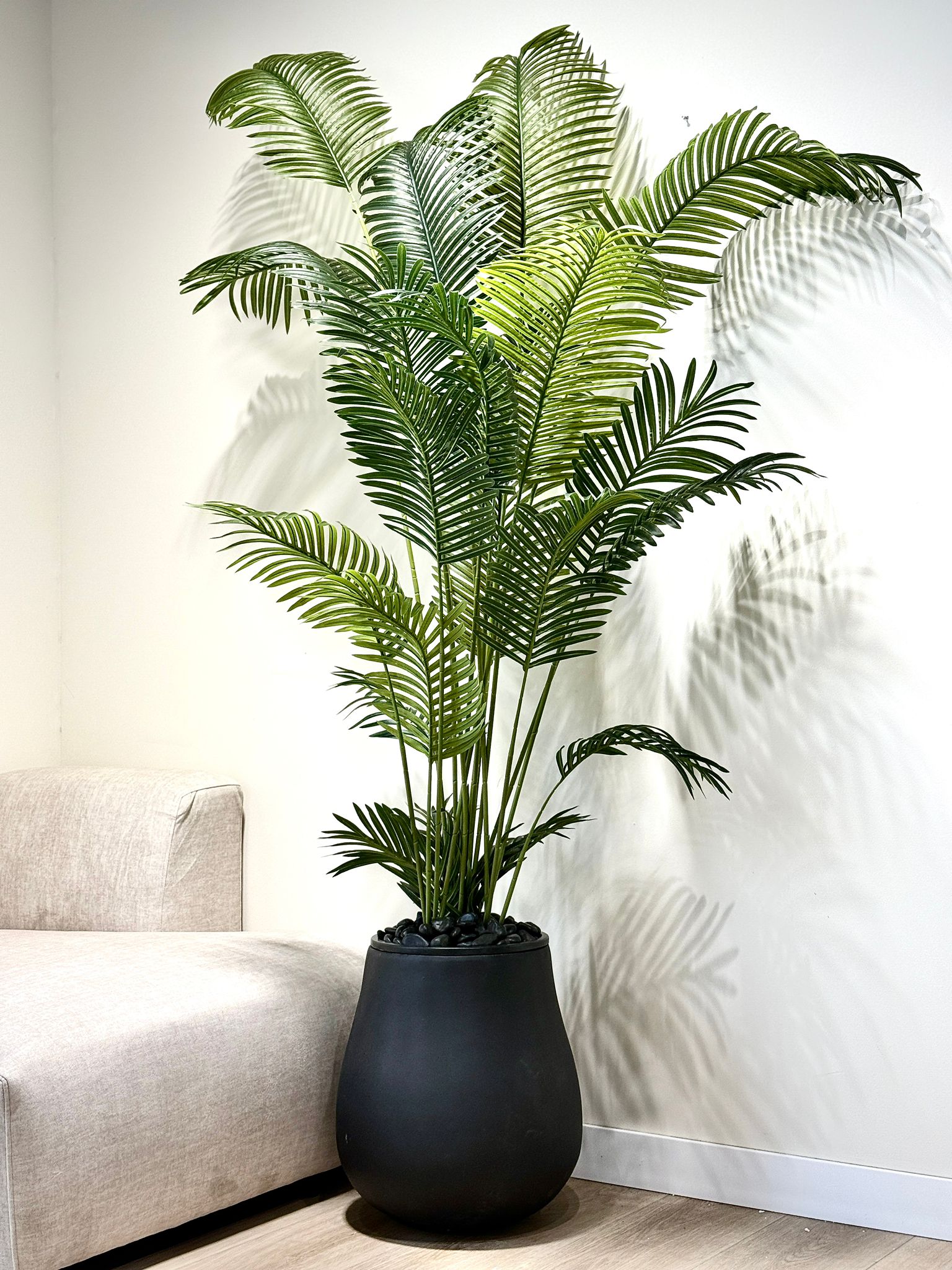 כד בטון רחב ונמוך בצורה אגסית מושלמת ומשדרגת בשילוב דקל מלאכותי ענק
