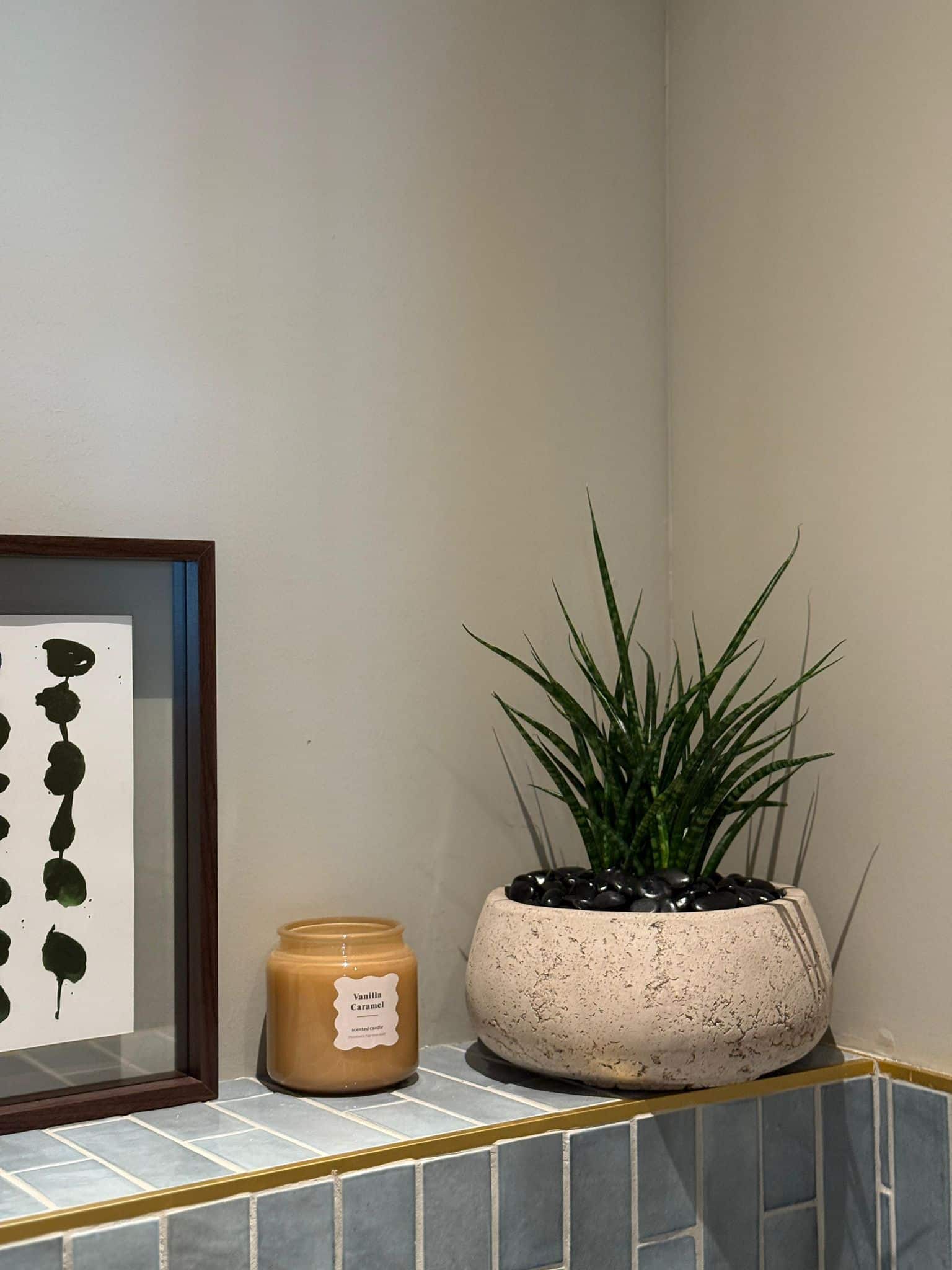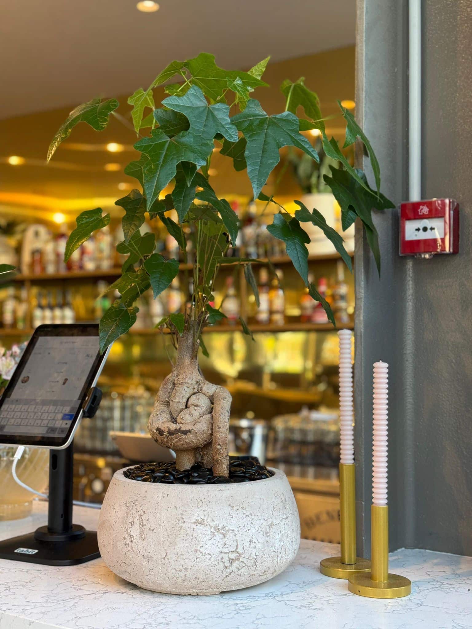 זוג כלי בטון מעוצבים בשילוב עץ אהבה וסנסיווריה מסולסלת.