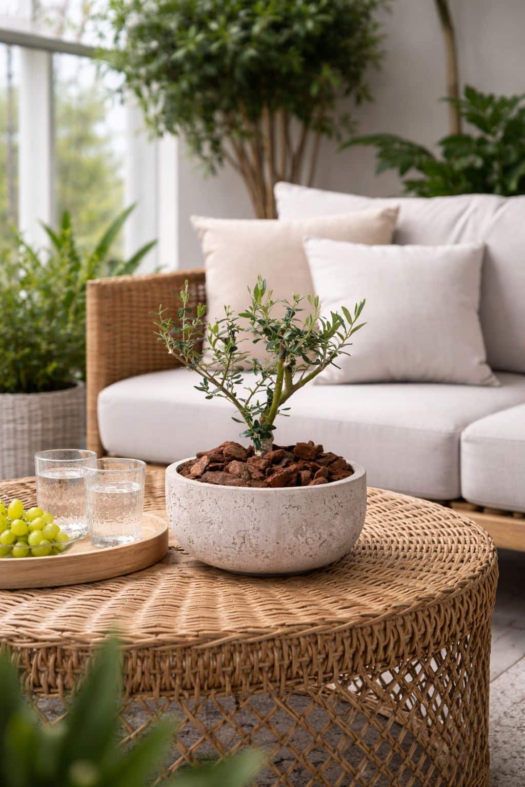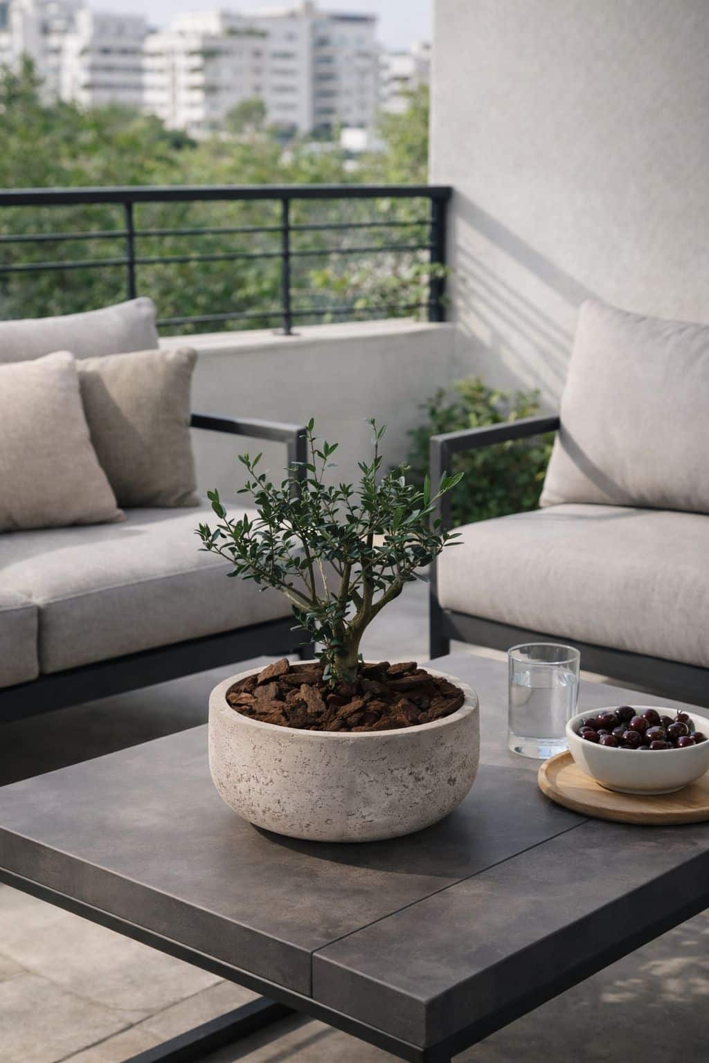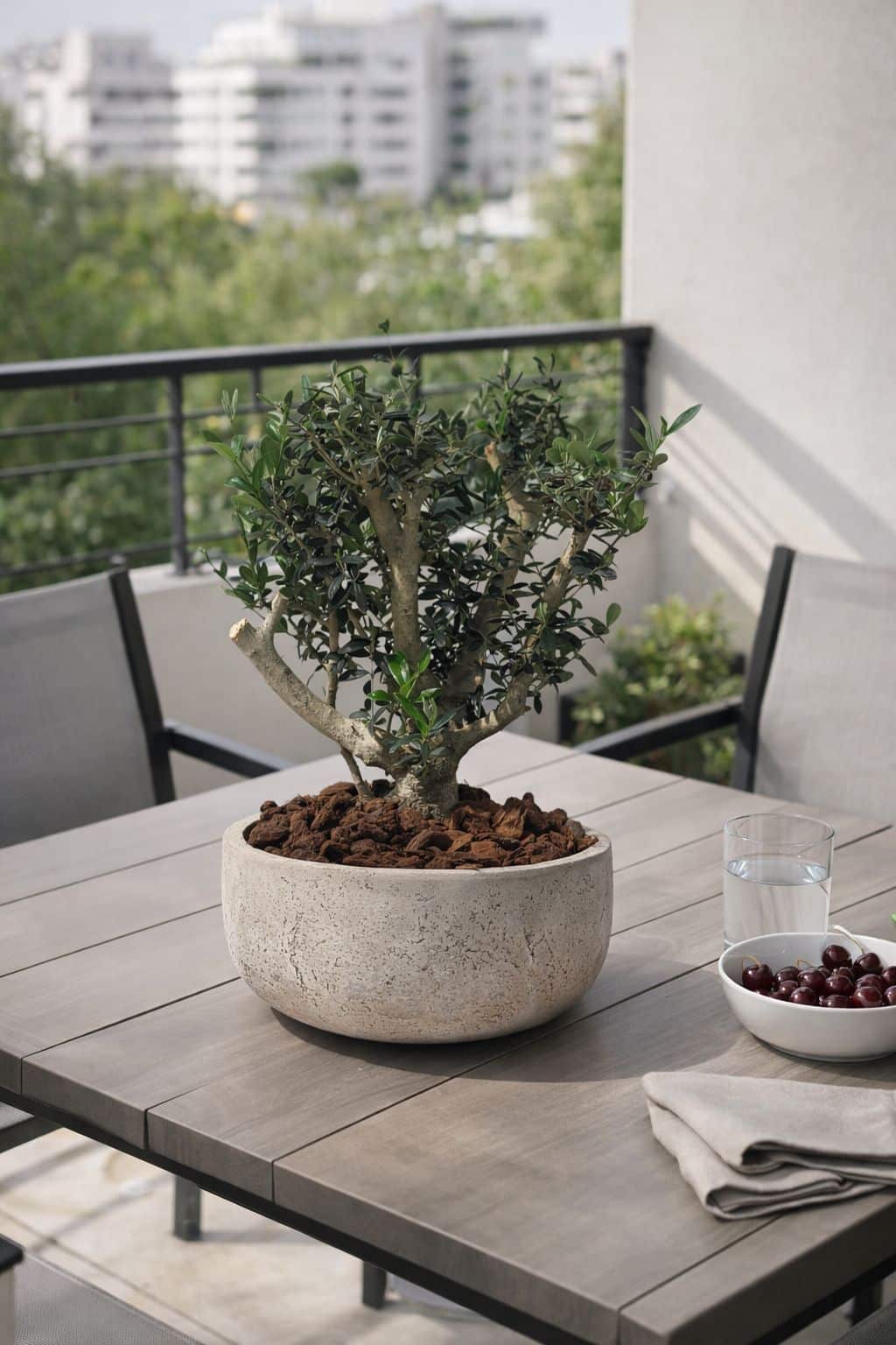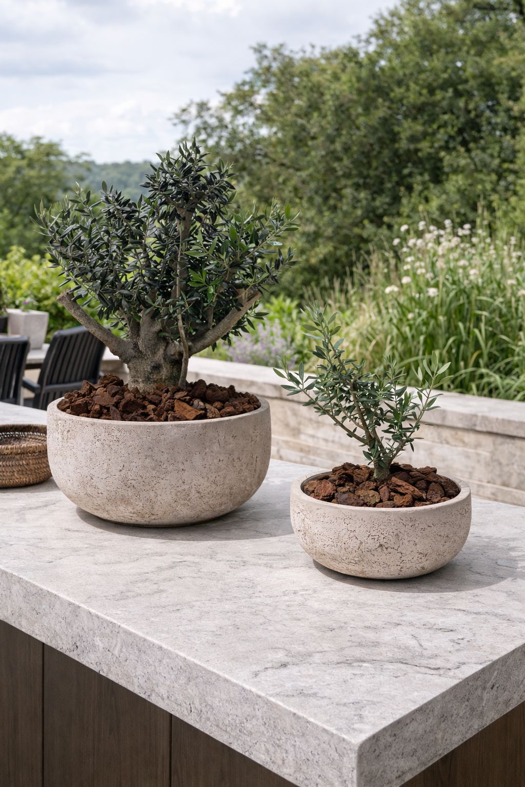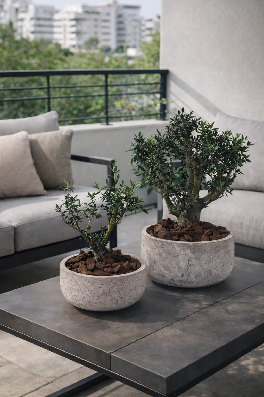 זוג כלי בטון מעוצבים בשילוב עץ זית טבעי ננסי + זית בונסאי ענק ומיוחד