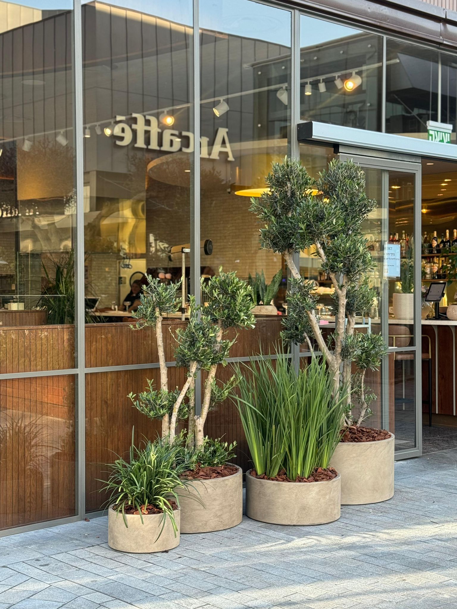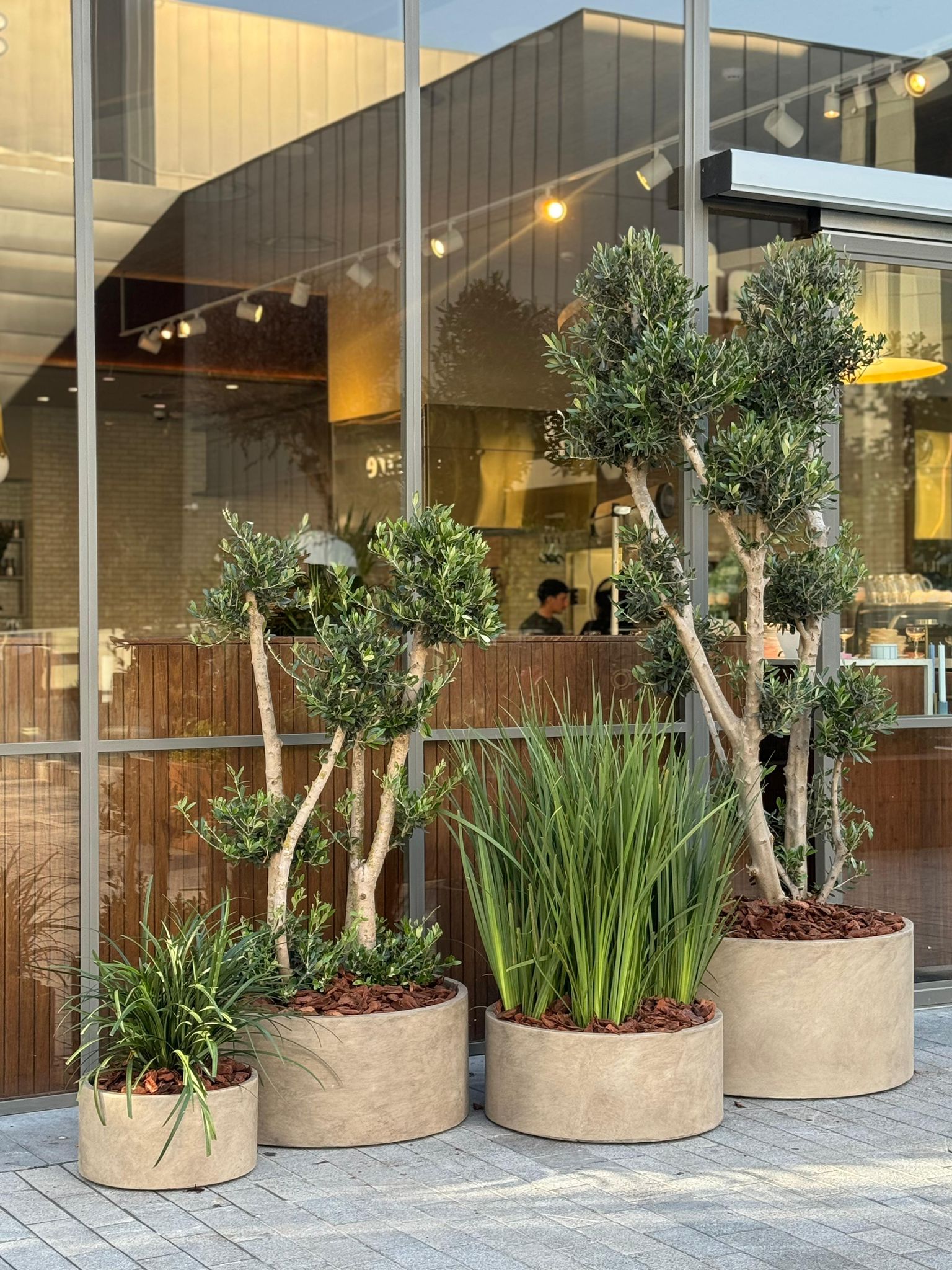 קערות בטון צילינדר בשילוב מיקס עצי זית ועשבוניים.