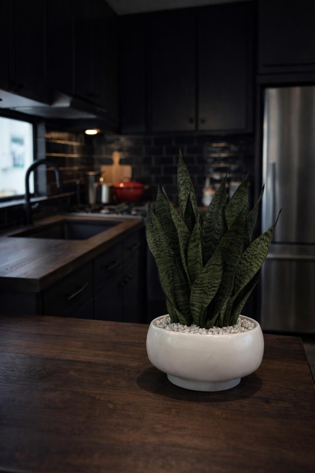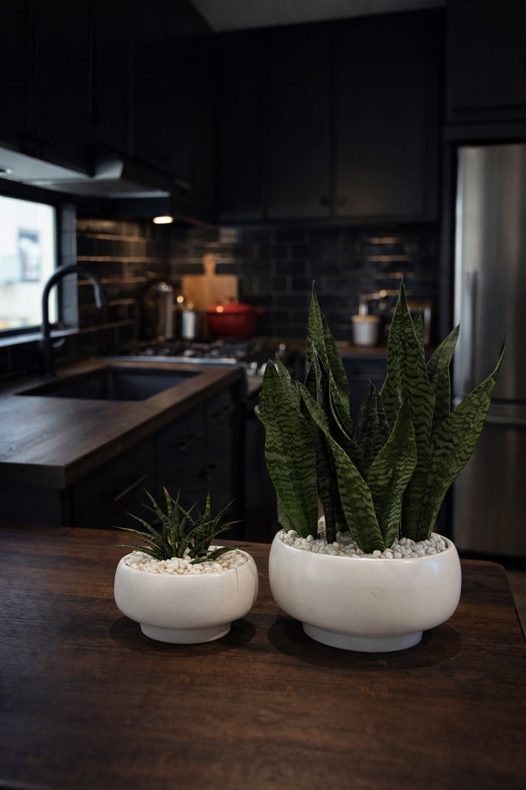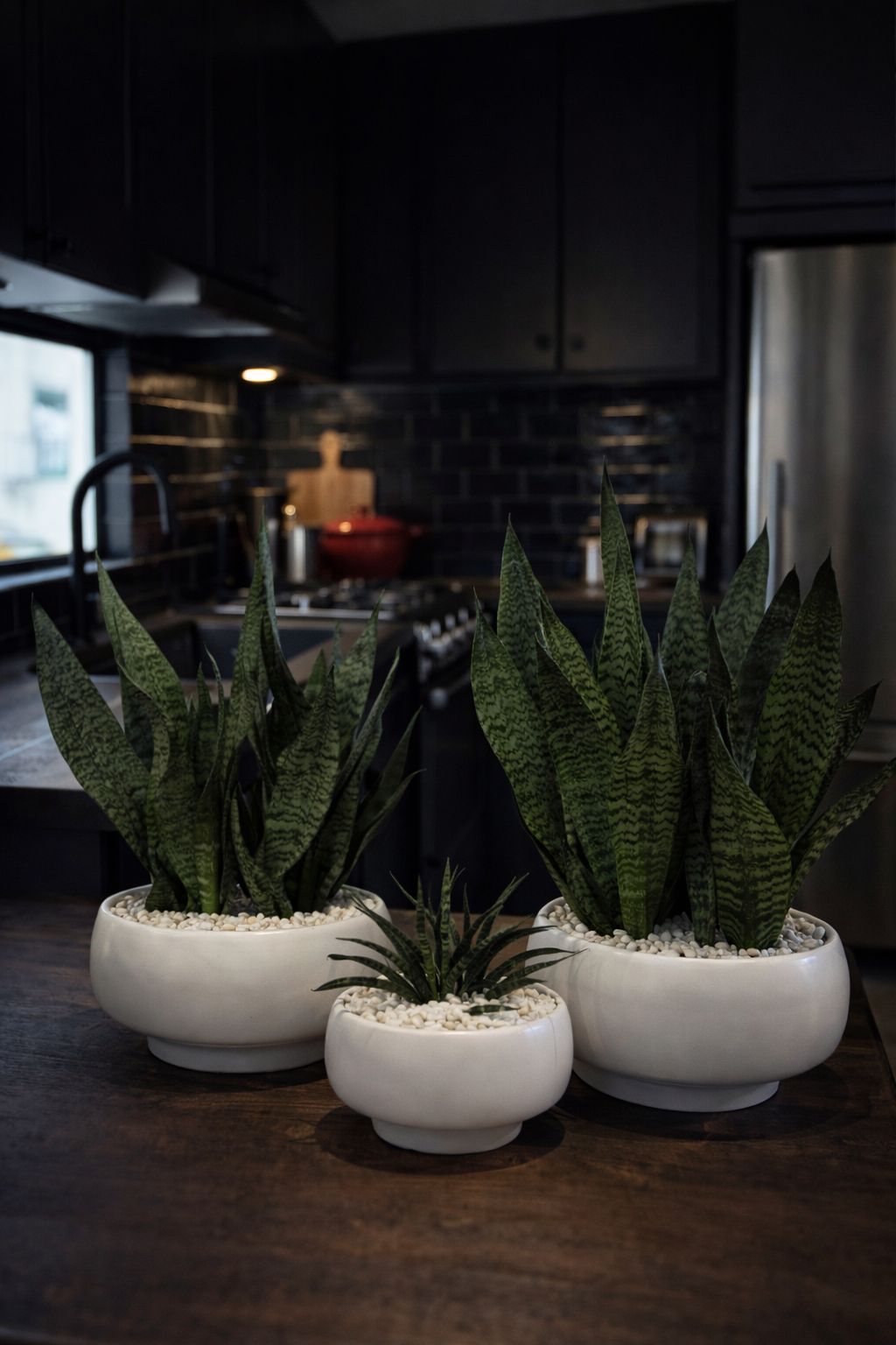 כלי קרמיקה לבן ב3 גדלים בשילוב סנסיווריה ירוקה טבעית