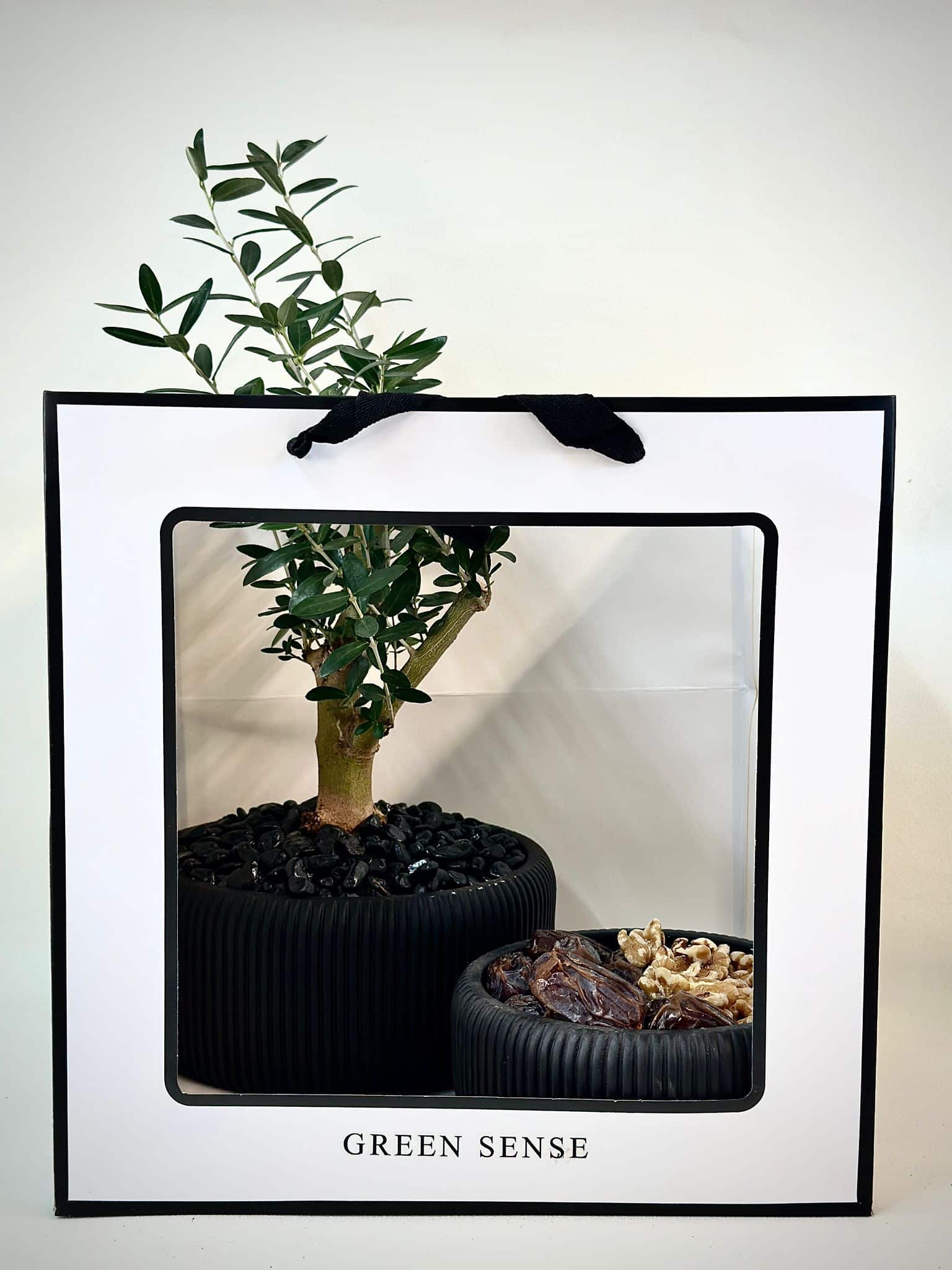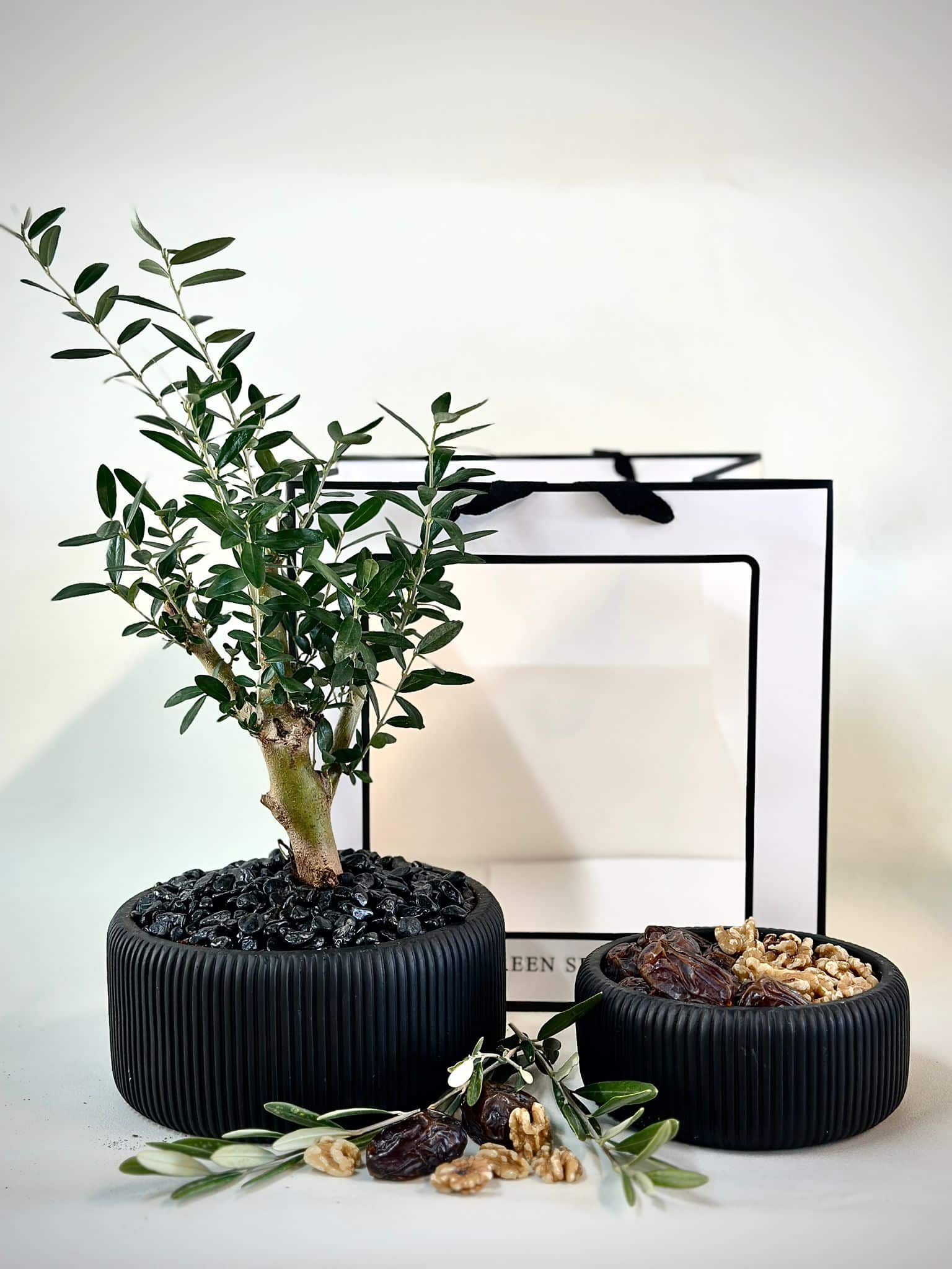 מארז חגיגי הכולל קערת בטון בעיצוב פסים בשילוב עץ זית טבעי